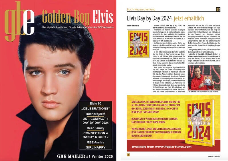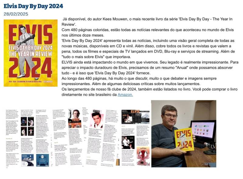 Now available, by author Kees Mouwen, the last book in the series 'Elvis Day By Day - The Year In Review'. With 480 full-color pages, there is all the relevant news about what happened in Elvis' world in the last twelve months. 'Elvis Day By Day 2024' features all the news, including a complete overview of all the new music, available on CD and vinyl. Plus, it covers every worthwhile book and magazine, every movie and TV special released on DVD, Blu-ray, and streaming services. Plus "everything else about Elvis" that mattered.